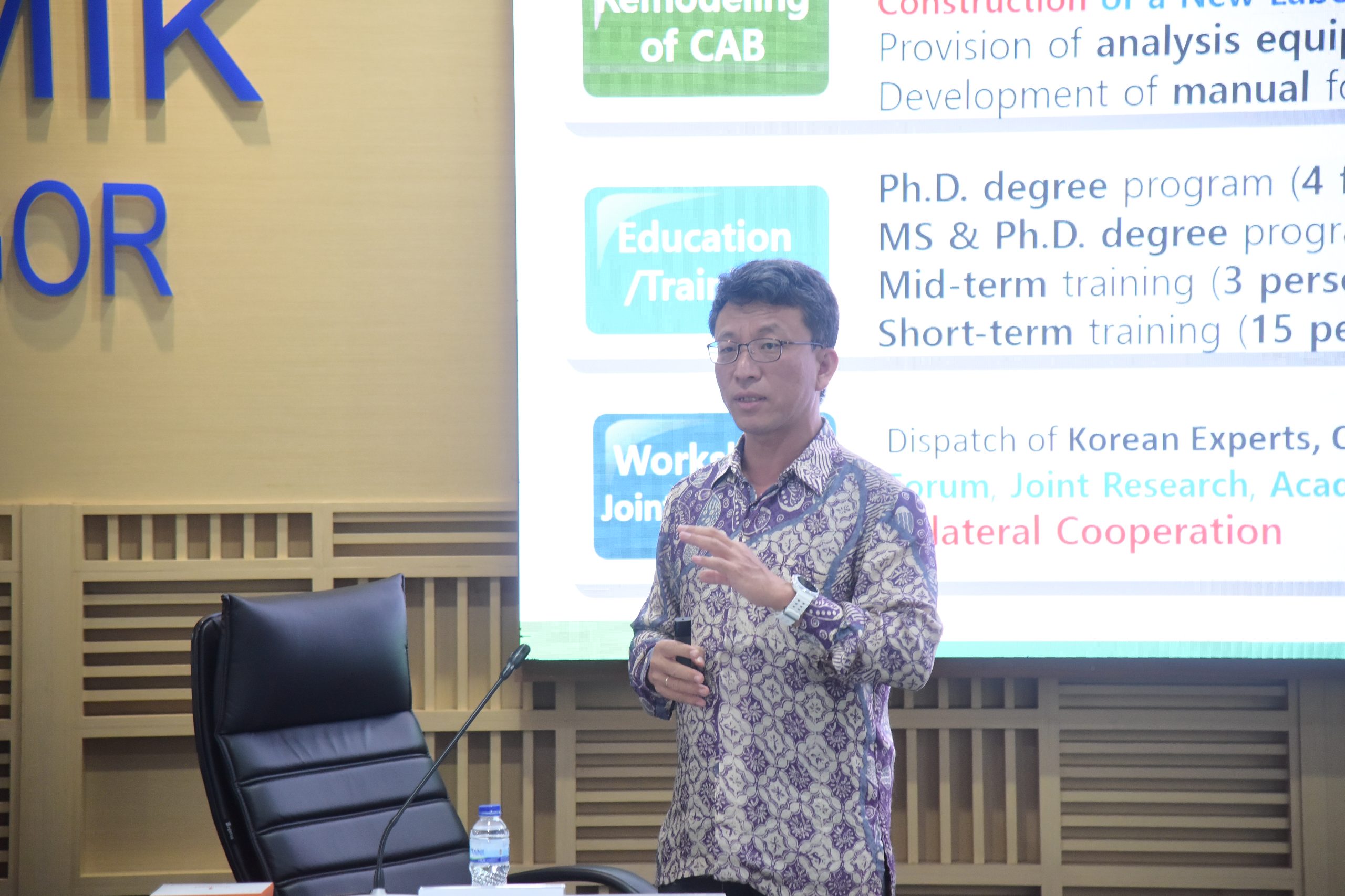 – 제2차 KOICA-ICAB 운영위원회는 보고르대학교(Dramaga 캠퍼스) 총장공관에서 진행되었으며 2025년 KOICA–ICAB 사업의 주요 성과인 KOICA 지원 ARLab 건물 리모델링, 동물세포배양실(Animal Cell Culture Laboratory) 구축 및 시범 운영, 그리고 NICAB(농업·생명과학연구센터) 설계 완료 등 핵심 성과가 보고되었음. 또한 KOICA 인도네시아 사무소에서 2026년부터 추진할 예정인 인도네시아 쌀 생산 증진 사업관련 보고르대학교의 계획 발표 등을 통해 향후 협력 방안에 대해서도 논의함.